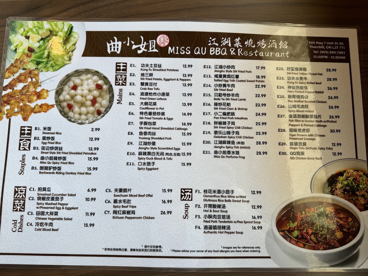 Miss Qu Barbecue & Restaurant offers a culinary adventure that will tantalize your taste buds with each bite. From the moment you step in, you're greeted with a vibrant atmosphere and a menu brimming with grilled delights and authentic Asian dishes. Don’t miss out on our specialties like the fish in chili sauce 忘不了干烧鱼 and the creamy spicy eggplant with century eggs and roasted peppers that are simply unforgettable. Pair your meal with our refreshing draft beer or indulge in our unique sides like the smashed cucumber salad 拍黄瓜 and stir-fried baby bok choy 油渣炝炒小唐菜. Whether you're a fan of seafood, meat, or vegetarian delights, there's something for everyone. Come discover the savory joy of our spicy stir-fried clams and the delightful scallops with garlic vermicelli. Join us at 505 Hwy 7 Unit 91-92, Thornhill, ON L3T 7T1, Canada, and treat yourself to the unforgettable tastes that only Miss Qu can deliver!
